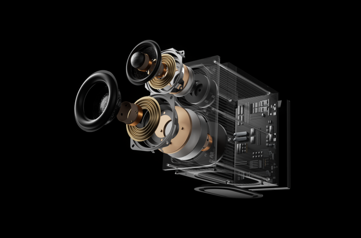 它将一个1英寸的丝膜软球顶高音单元置于3英寸碳纤维振膜中音单元的正中央,实现了高、中音“一点发声”的点声源结构,从根本上解决相位失真问题,同时又让人声和乐器比较集中的中频不再受低频切割振动的影响,人声会更加清晰,乐器的分离度也会更好。低频则由一只独立的3.5英寸碳纤维低音单元负责,箱体底部还设计了一个5英寸的跑道型无源辐射器来增强低频延伸和量感。